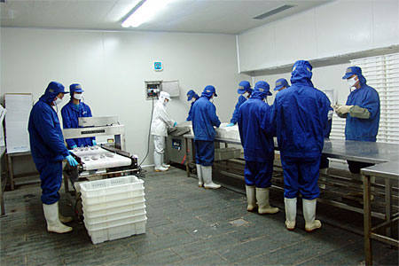 本公司是一家以水產品加工為主的出口型企業,于2004年9月建成并正式投產。公司廠房完全按照歐洲聯盟的標準設計施工,目前占地14000平方米,建筑面積8000平方米,其中加工車間1600平方米。公司日速凍能力達100噸,儲藏庫容量為5000噸,主要加工蟹類、貝類、頭足類及魚蝦類水產品,產品銷往日本、東南亞及歐盟地區。